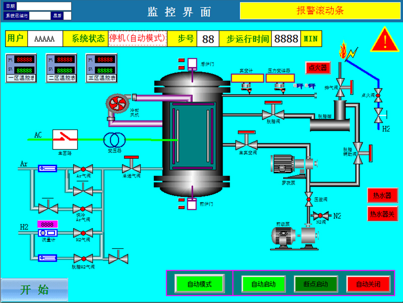 通過(guò)我們公司的系統(tǒng)可以時(shí)時(shí)監(jiān)控水壓、電壓、氣壓。能按工藝自動(dòng)完成生產(chǎn)。有效的節(jié)省人力、物力等方面的成本。提高了產(chǎn)品的合格率。為公司創(chuàng)造更大的利潤(rùn)。我們的軟件廣泛用于高真空釬焊爐、石墨化爐、碳化爐、TP爐、熔煉爐、碳化硅燒結(jié)爐、金屬鉭片爐、鎢絲高溫真空爐、藍(lán)鎢爐等